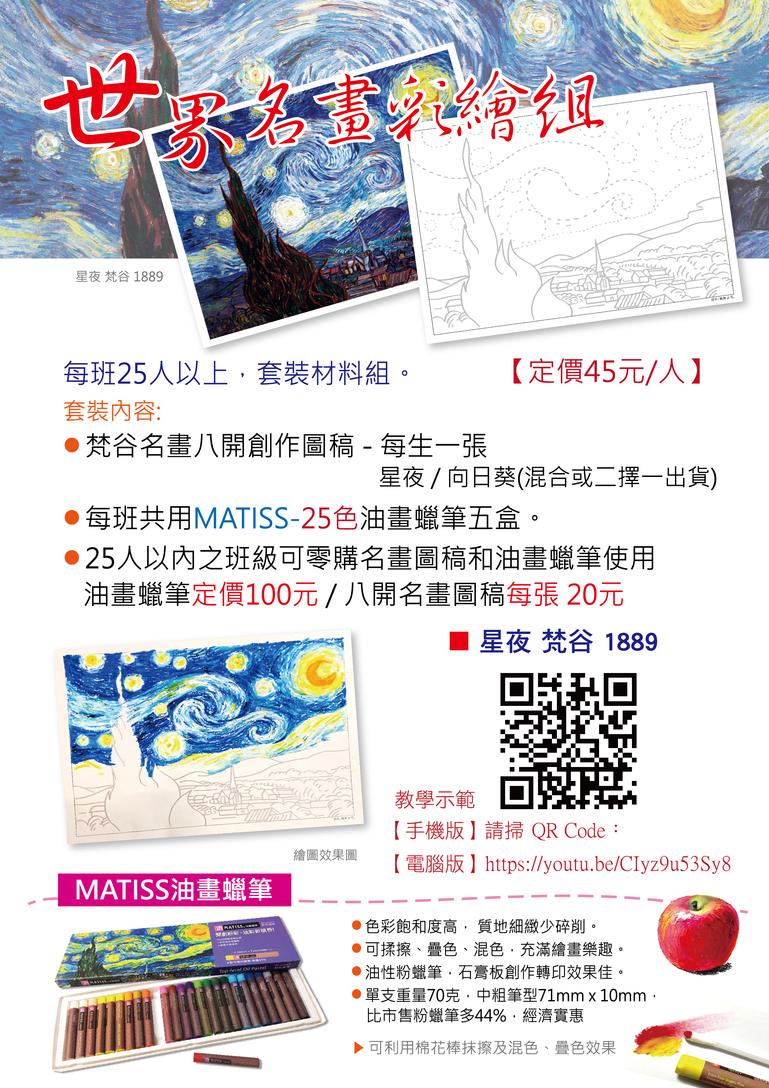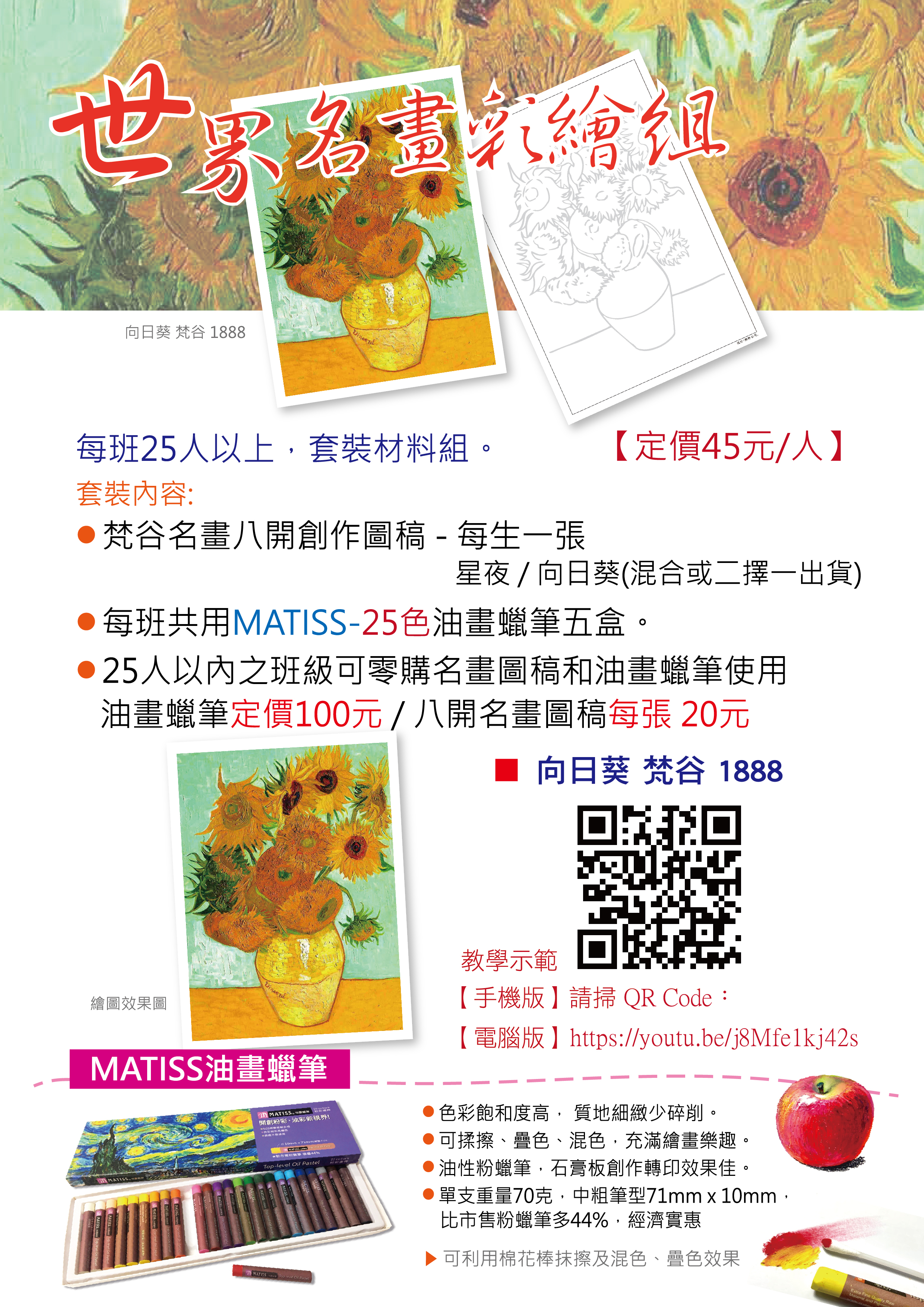 ●MATISS-25色油畫蠟筆 每班共用五盒【◎25人以內的班級可以零購】:●油畫蠟筆(25色),售價100元/盒●名畫圖稿(八開) ,售價20元/張